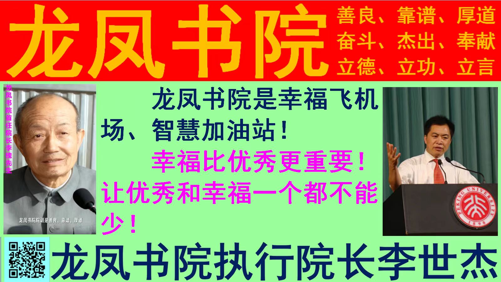 李燕山先生姓李名槐字根深,是燕山之子,是龙凤书院首任院长,是京津冀一体化的先行者——河北人的儿子、天津人的先生、北京人的爸爸,是兴家旺族的典范——创办龙凤书院兴家庭、兴国家,旺家族、旺民族,培养的儿子李世杰在中国教育报和光明日报教育家杂志发表文章、在中央人民广播电台和中国教育电视台主讲系列教学讲座、在北京大学出版社和清华大学出版社出版图书和光盘;培养的女儿李秀春是高级教师,在《小学校长》《教育》杂志发表文章,在北京大学出版社出版图书,是走向世界的奉献者——四个孙子、孙女考进五个国家八所一流大学,在行业世界一流单位工作(详见下文)! 燕山之子、李父五教创立人、龙凤书院首任院长李槐先生 在2005年说:“如果一个人的人性不好,绝不会因为上大学、当大官、挣大钱而更幸福!”泃河之女、李母五教创立人、龙凤书院首任首席教育家潘凤兰先生以身作则、率先垂范,引领孩子和学员感恩、包容,自尊、自律、自强、自信,提前、创优、超额! 李槐李燕山先生既是家庭发展史上的一座丰碑,又是龙凤书院发展史上的一座丰碑!他既是家庭的李德胜,又是龙凤书院的李德胜! 龙凤书院幸福成长俱乐部——让每一位走进龙凤书院的家长实现家庭幸福、孩子杰出、事业辉煌的目标,让每一位走进龙凤书院的学生实现快乐学习、幸福成长、高质量发展的目标! 教育就是做榜样,学习就是学榜样!教师要做学生的榜样,家长要做孩子的榜样,父母要做儿女的榜样,长辈要做晚辈的榜样,哥哥、姐姐要做弟弟、妹妹的榜样!只有像榜样了、做榜样了,才是真教育了、真学习了!假教育比不教育还糟糕,假学习比不学习还糟糕,假懂事比不懂事还糟糕,假热情比不热情还糟糕,假努力比不努力还糟糕!判断真假的一个重要标准是——是否更加优秀、更加幸福! 龙凤书院执行院长、万星工程执行团长李世杰谈万星工程的初心和使命是——为党和国家发现和培养数万颗栋梁之才之星,让伟大的祖国星光无限,让中国之星照亮全世界! (点击下面两张图片可看视频和更详细文字介绍)