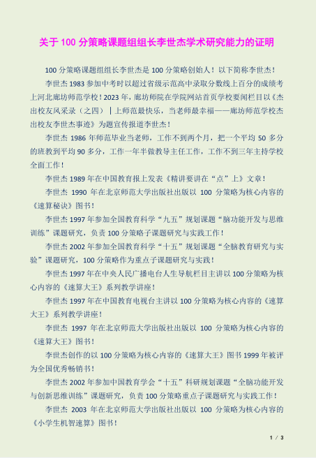 李世杰主任的侄女李远是100分策略学习者、实践者和受益者!李远上学时学习成绩名列前茅,年年被评为三好学生!李远积极参加课外实践活动,是一个品学兼优的学生!李远上中学时应邀参加清华大学出版社等出版的光盘教学节目,应邀参加在北京大学百年讲堂召开的中国杰出青少年高峰论坛,高中毕业时以一流成绩考上会计专业被公认为澳洲专业排名第一的大学的会计专业,到澳大利亚留学,又以优秀成绩攻读本校金融硕士研究生!