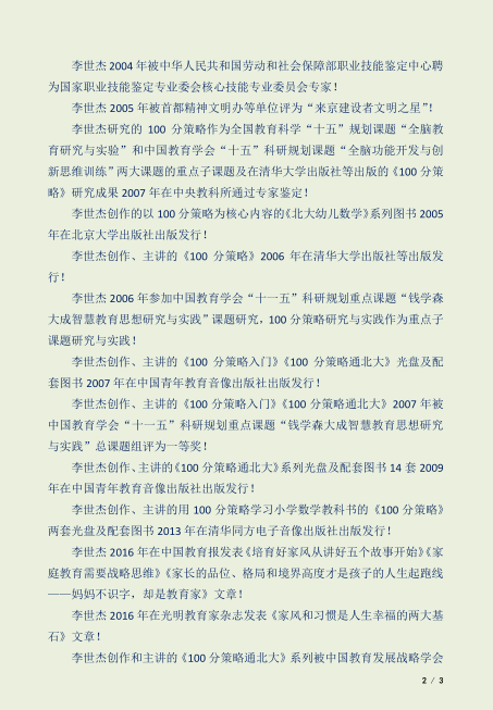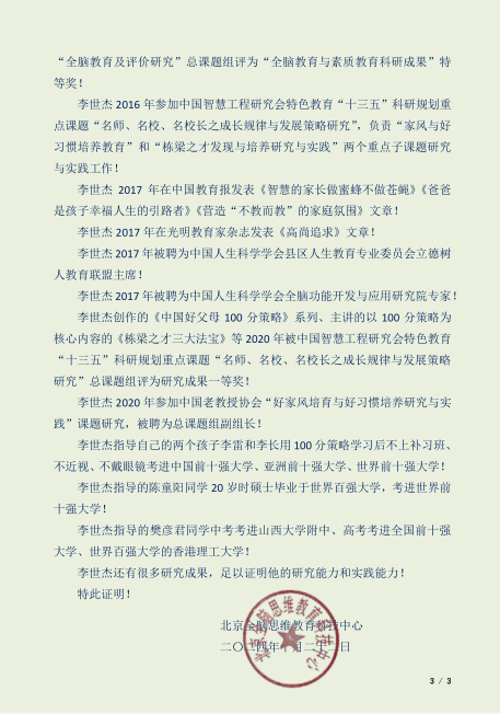 领袖策略课题组组长、万星工程专家团执行团长、龙凤书院执行院长,引领全国渴望更优秀、更杰出的家长和学生从教育源头、教育根本上抓起,铸就家庭幸福、孩子杰出、事业辉煌的人生! 全国家风与好习惯课题组实施十百千万工程,把科教兴国、人才强国、创新驱动发展战略的重担放在心上、挑在肩上,带领杰出教育专家团队立德树人、为虎添翼、为龙点睛,帮助更多的人实现家庭幸福、孩子杰出、事业辉煌目标,培养更多的中国人物! 普通教师带着知识面对学生,优秀教师带着学生面对知识,杰出教师带着学生面对世界! 铸就家庭幸福、孩子杰出、事业辉煌、精忠报国的快乐人生、幸福人生、精彩人生、美丽人生! 人的差别在于习惯!养成什么人的习惯,就会成为什么样的人! 不承认差距,不知道差距,将导致更大的差距!我们和杰出的人不一样的地方,就是我们和他们的差距! 我们离成功有多远?只有三步——知道,做到,习惯!学习,学习,学习惯! 我们让“ 事业上来了,孩子下来了”“企业上市了,孩子出事了”“一代不如一代”成为过去的人家的故事!我们帮助更多的家长把孩子培养成为全家 最值得骄傲、最值得自豪、最增值、最有尊严的最宝贵财富!领袖策略课题组组长、万星工程专家团执行团长、龙凤书院执行院长、中国好父母工程专家团执行团长李世杰承担的全国教育课题网站 100分策略通北大 栋梁之才发现与培养 好家风与好习惯 全脑思维教育